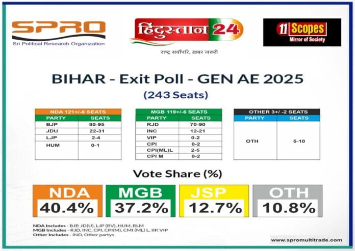 पॉलिटिकल रिसर्च ऑर्गनाइजेशन (SPRO) हिंदुस्तान 24 और 11scopes mirror of society द्वारा जारी बिहार विधानसभा चुनाव 2025 के एग्जिट पोल में सत्तारूढ़ एनडीए (NDA) गठबंधन को मामूली बढ़त मिलती दिख रही है। 243 सीटों वाली विधानसभा में एनडीए को 121±6 सीटें मिलने का अनुमान जताया गया है, जबकि विपक्षी महागठबंधन (MGB) को 119±6 सीटें मिलने की संभावना है।