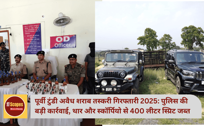 पूर्वी टुंडी अवैध शराब तस्करी गिरफ्तारी 2025 के अंतर्गत पुलिस ने थार व स्कॉर्पियो से 400 लीटर स्प्रिट, अवैध शराब की बोतलें और स्टीकर जब्त किए। एक आरोपी को मौके से गिरफ्तार किया गया।
