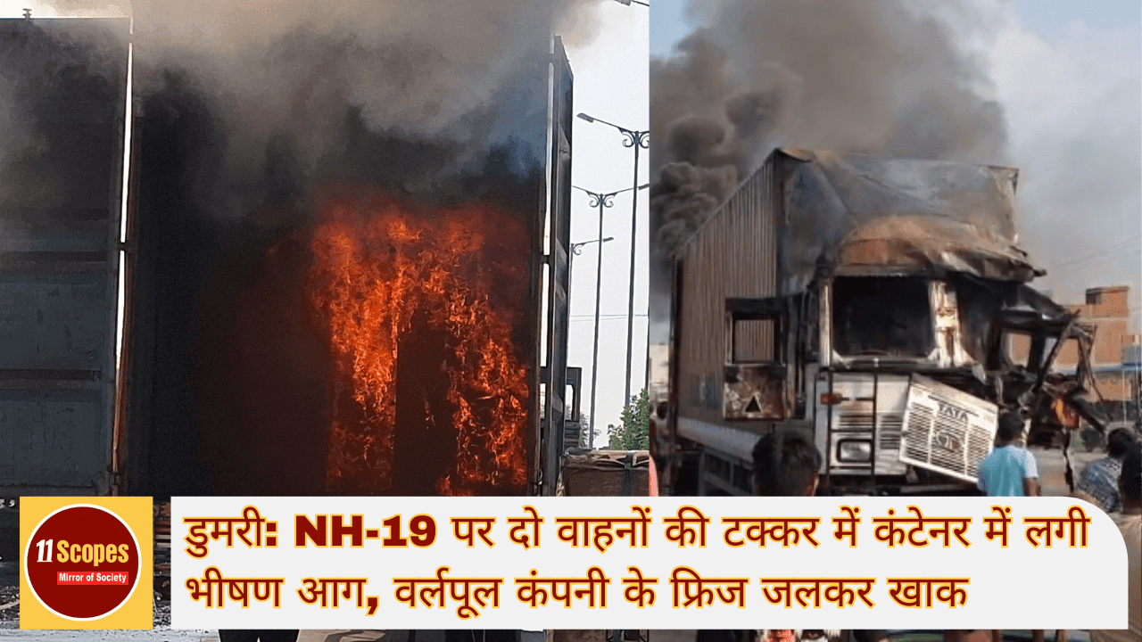 डुमरी (गिरिडीह), 15 मई 2025 — झारखंड के डुमरी थाना क्षेत्र में एनएच-19 (राष्ट्रीय राजमार्ग 19) पर बुधवार को एक भीषण सड़क हादसा हुआ। कुलगो टोल प्लाजा के समीप दो वाहनों की टक्कर के बाद एक कंटेनर में भीषण आग लग गई, जिससे कंटेनर में लदा Whirlpool कंपनी का फ्रिज जलकर खाक हो गया। हालांकि राहत की बात यह रही कि इस दुर्घटना में कोई हताहत नहीं हुआ।
