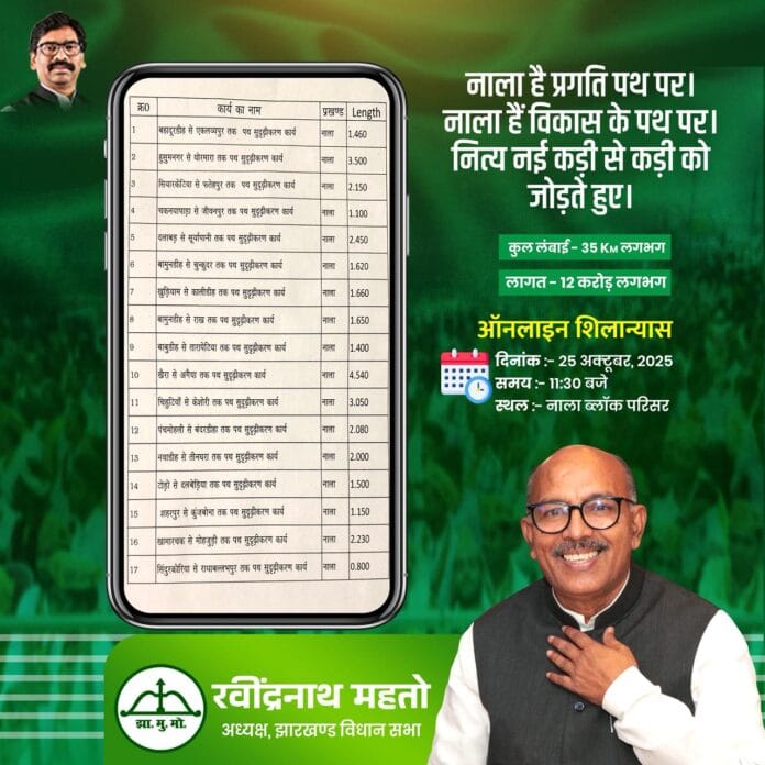 जामताड़ा: झारखंड विधानसभा अध्यक्ष रविंद्र नाथ महतो के प्रयासों से नाला प्रखंड में विकास की एक और नई शुरुआत होने जा रही है। क्षेत्र के लोगों के सुगम आवागमन और ग्रामीण बुनियादी ढांचे को सशक्त बनाने के उद्देश्य से नाला क्षेत्र में लगभग 35 किलोमीटर लंबाई की 17 सड़कों का निर्माण किया जाएगा, जिसकी कुल लागत करीब 12 करोड़ रुपये होगी।